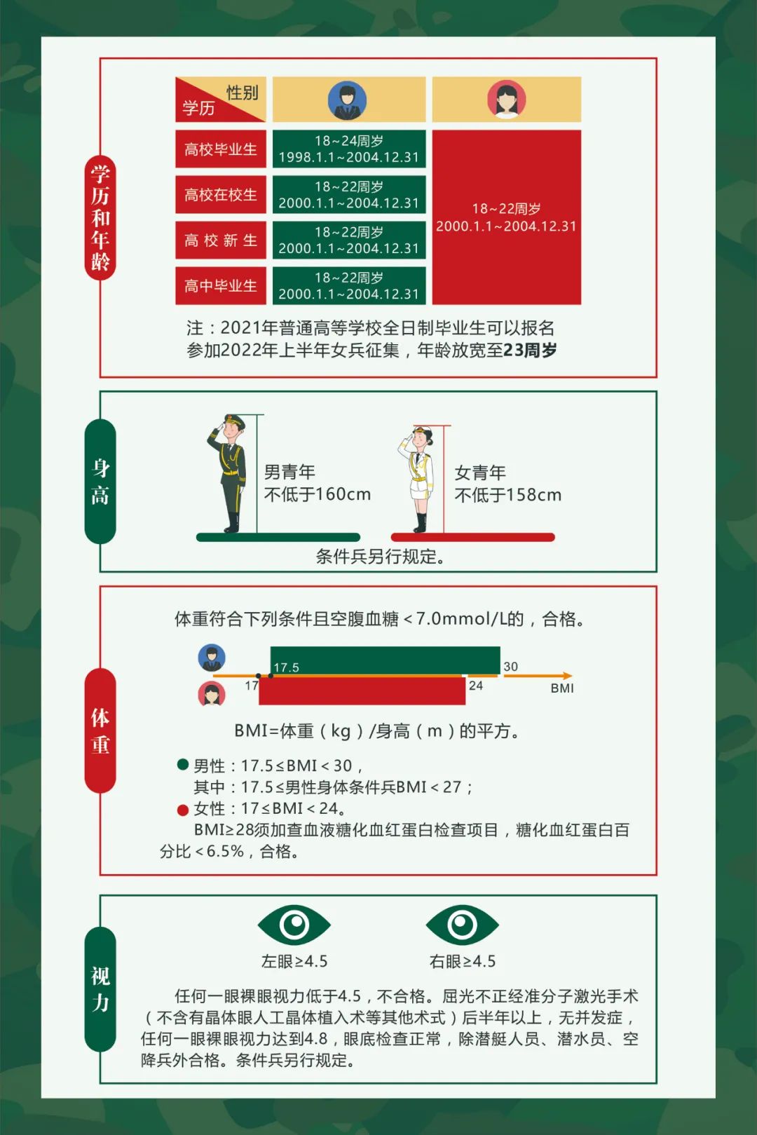 3、視力要求:裸眼視力需達(dá)到一定標(biāo)準(zhǔn),包括遠(yuǎn)視力、近視力及色覺等,如有近視,需符合軍隊(duì)規(guī)定的矯正視力標(biāo)準(zhǔn)。