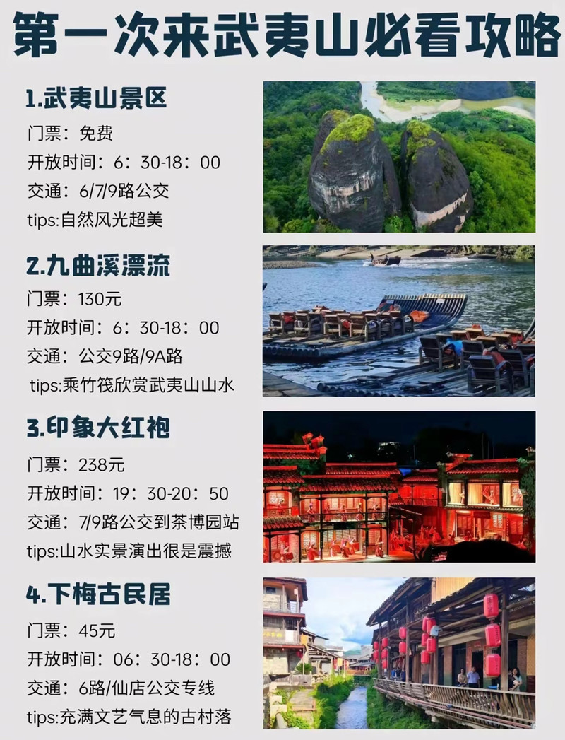 3、品嘗美食:武夷山的美食也是一大亮點(diǎn),如武夷山烤魚、土雞等,游客可以在當(dāng)?shù)氐牟宛^品嘗這些美食,體驗當(dāng)?shù)氐娘嬍澄幕?,武夷山的旅游景點(diǎn)豐富多樣,既有自然風(fēng)光,又有文化底蘊(yùn),游客可以根據(jù)自己的興趣和時間安排進(jìn)行選擇,在旅行過程中,請注意安全、環(huán)保和尊重當(dāng)?shù)匚幕?xí)俗原則下享受這次美好的旅行體驗吧!